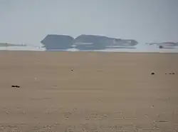 In certain areas, including expanses of sand or surfaced roads, mirages can easily form under the hot conditions. These are a form of heat haze or shimmer, that can give a distant object the appearance of being viewed on a water like surface. The object often looks expanded vertically, so that e.g. a low hill can look like a tower or town. A mirage can also make it appear you are seeing a distant lake or shore, when no such body of water exists.