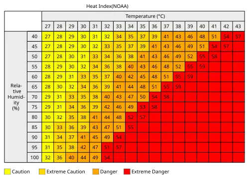The effect of a heat wave can vary dramatically depending on humidity, which affects the temperature that one feels on one's skin. A person experiencing a dry heat wave may begin to feel discomfort when it is 32 °C (90 °F), but the same temperature and 75% humidity would feel like 43 °C (109 °F)! Humidity is not felt equally by everyone, but prepare for the worst, since when temperatures reach the upper 90's Fahrenheit and humid, no-one can cope who is not accustomed to these extremes.