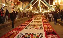 - Night Nobody Sleeps — designs can be fanciful, imaginitive, or dignified and reflective. Each family or artist designs their own carpet panel. On the Night Nobody Sleeps, they sketch it out on the street in a designated frame which is carefully filled with pre-colored sawdust or paper shreds. Tinsel, sparkles and paper adornments are added to flesh out the design. For several hours, the carpets are left undisturbed while people walk the streets, admiring their craftsmanship. Then the parade starts with the procession of the Virgen of the Asuncion. Months of preparation and hours of work disappear as the parade proceeds to trample the carpets.