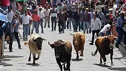 Huamantla is a popular weekend destination among residents of Mexico City who come for the colonial downtown area and the variety of cultural events, including the Feria Huamantla — a celebration of Our Lady of Charity featuring a night on which residents create a 6-km-long carpet in the city streets, and the annual "Huamantlada", an aderenaline rushing running of the bulls through the city streets, similar to the famous event held in Pamplona, Spain. Huamantla is a designated Pueblo Magico.