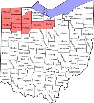 Lucas County, Defiance County, Fulton County, Hancock County, Henry County, Huron County, Paulding County, Putnam County, Seneca County, Williams County, Wood County