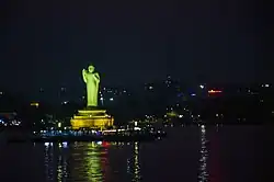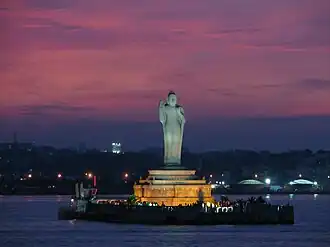 - π Hussain Sagar (Tank Bund), Necklace Rd. The artificial lake is a historical landmark, built during the reign of Ibrahim Quli Qutb Shah in 1562 by damming the Musi. This forms the boundary between Hyderabad and Secunderabad. Surrounding the lake are various parks, temples, statues and historical buildings. This is one of the few walkable places in the city. At the centre of the lake stands a famous 18m high π statue of the Buddha installed in 1992. Boat rides to the Buddha statue are available from Eat Street (near Necklace Road MMTS Station) and Lumbini Park. Speed boats do not stop at the Buddha statue. The road circling the lake on the north and west is known as Necklace Road, and is nicknamed "the Chaupati of Hyderabad" due to its resemblance to the Girgaon Chowpatty in Mumbai.