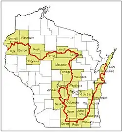 The trail roughly follows the location of the terminal moraine from the last Ice Age. As the route traverses the moraine, it sometimes meanders into areas west of the moraine, including the Driftless Area in southwestern Wisconsin. The trail passes through 30 of Wisconsin's 72 counties, from the northwestern part of the state to the Lake Michigan shoreline in the east. The western end of the trail is at Interstate State Park along the St. Croix River, which is the border between northwestern Wisconsin and eastern Minnesota. The eastern terminus of the Ice Age Trail lies at Potawatomi State Park, along Wisconsin's Door Peninsula off of Sturgeon Bay.