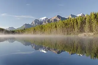 The road runs in the flat of a U-shaped glacial valley climbing from the south and the north ends to its highest point. In the northern section the Athabasca and Sunwapta rivers run north, the southern section the Bow river runs south, and the central section is the source of the Mistaya and North Saskatchewan rivers which flow north then east. The mountains, mainly sandstone but also some limestone rock, rise high on both sides of the road displaying spectacular sedimentary and glacial formations. The ridges of the western mountains form the continental divide.