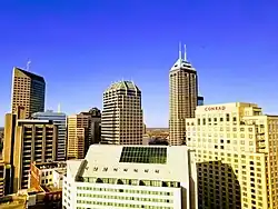 - 🌍 Sheraton Indianapolis City Centre, 31 W Ohio St, ☏ +1 317-635-2000. Features 378 guest rooms and suites and 18,000 square feet of meeting space. On-property dining options include Alexanders Bar & Grill, Circle Cafe and Starbucks.