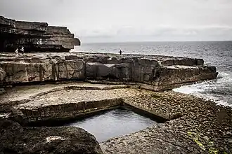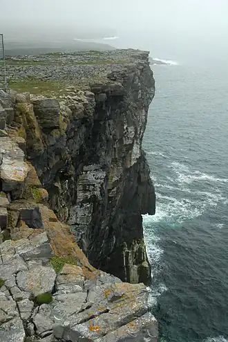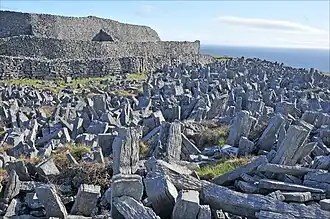 - 🌍 Dún Aonghasa (Dun Aengus), ☏ +353 99 61008. Daily Apr-Oct 9:30AM-6PM, Nov-Mar 9:30AM-4PM. A stone fort from 1100 BC perched on the edge of a sheer 100 m cliff. It's in a D-pattern with three ring-walls and an unusual outer chevaux de frise: a barrier of sharp upturned rocks of the kind used by the Frisians against cavalry charges. (What prehistoric military genius was expecting a cavalry attack from Frisia?) There's also a huge stone slab, of unknown but presumably grisly function. The walls have been reconstructed to a height of 6 m and are up to 4 m thick. It's possible the fort was once oval and lost half to cliff erosion, but true D-pattern forts are found elsewhere. Visitor vehicles and bikes come as far as the visitor centre, then you hike 1 km uphill to the fort, the trail is hard rock and slippery when wet. There are strong winds but no fence at the cliff edge, so grasp small children with a grip of steel. The site gets very touristy when all the day-trippers disgorge from their minibuses. Adult €5, conc €4, child €3.
