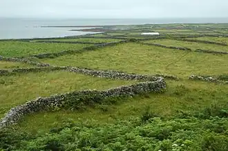 Inis Mór and the other Aran Islands are an extension of the Burren limestone country of County Clare. The terrain has been scraped bare by glaciation and lacks natural topsoil, so it's a poor prospect for farming. People probably fled here from prehistoric turmoils on the mainland, and the oldest remains are the line of forts that go back to 1000 BC. The rock-strewn fields were gradually cleared by heaping the rocks into walls, seaweed was heaped on for fertiliser, and dirt from cracks in the limestone was gathered for topsoil. The result is a green and grey treeless mosaic, ending abruptly in cliffs. Tourism is nowadays the main industry.