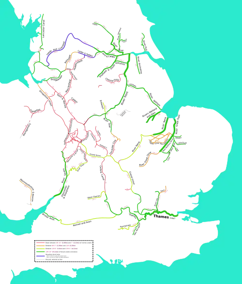The modern network in England consists of a series of linked waterways (both river and canal), some isolate navigable rivers and the Norfolk Broads.