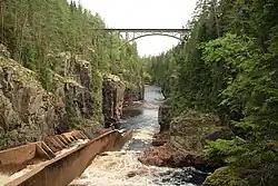 Ämån in Orsa. The construct to the left is for log driving, for which the river was important. The railway bridge in the background. - 🌍 Borlänge C