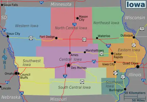 - Interstate 80: The state's major east-west interstate, it services major cities including Davenport, Bettendorf, Iowa City, Des Moines and Council Bluffs. Most other major cities including Cedar Rapids and Ames are within a half hour drive of I-80.