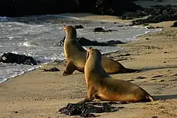 A pair of GalΓ‘pagos sea lions on the beach in the early morning
