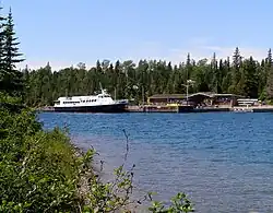 The ferries from Michigan dock at Snug Harbor, an inlet of Rock Harbor near the east end of the island; this is the largest populated area on the island. Because Rock Harbor Lodge, Rock Harbor campground, and Rock Harbor Visitor Center are here, this site is commonly referred to as "Rock Harbor", even though that actually describes the whole miles-long stretch of water. The ferries from Minnesota dock at "Windigo", a smaller port at the west end of the island and "Rock Harbor". Each port has a small camp store, drinking water, modern restrooms, pay showers, and coin laundry; these are the only such facilities in the park.