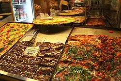 Two items closely related to bread are focaccia and pizza. Focaccia, which is essentially a form of oily bread with other items in the dough, is a specialty of bakeries. It may or may not be thinner than typical bread, but even at its thinnest, it is not likely to be nearly as thin-crust as Italian pizza. It is available in both savory and sweet flavors. Possibilities are greater than could be stated here, but common ones include onions, rosemary (rosmarino), potatoes (patate), salami (salame), artichokes (carciofi), tomatoes (pomodori), and late in wine harvesting season, grapes (uva).