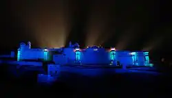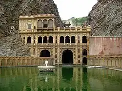 - 🌍 Nahargarh Fort, Krishna Nagar, Brahampuri, ☏ +91 14 1518 2957. 10AM-6PM. The smallest of the three forts, notable primarily for excellent views over Man Sagar lake and the vast sprawl of Jaipur. Built in 1734 by the Maharaja Sawai Jai Singh II in a mix of Indian and European styles, the fort also houses the (relatively) compact Madhavendra Bhawan palace, although its former splendour is fading under layers of graffiti and pigeon droppings. Some of the film Rang De Basanti were shot at this fort. To get to the area where the "Pathshala" song was shot, take a left turn as soon as you enter the fort. An autorickshaw can be taken from the stand in front of the Amber fort. The fort also houses the Jaipur's Wax Museum and Sheesh Mahal, although tickets for these have to be bought separately and are ridiculously expensive. Beware if buying the Wax Museum and Sheesh Mahal combo ticket, you'll be paraded through the largely unimpressive museum and then be told to queue for the Sheesh Mahal which can last from 30 minutes to 2 hours. ₹50/200 for Indians/foreigners. Included in the 5-monument Composite Ticket. ₹400/₹700 (Indian/foreigners) for the tour of the Wax Museum and the Sheesh Mahal..