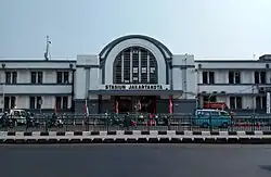 There are 12 railway stations in West Jakarta. Most of them are served by one or more lines of Jakarta's commuter rail network (KA Commuter Jabodetabek). The main station is π Jakarta Kota station in the old town, serving the red line to Depok and Bogor, the blue line to Bekasi, and the pink line to Tanjung Priok port in North Jakarta. π Duri station serves the brown line to Tangerang, the yellow line to Depok and Bogor/Nambo, as well as intercity trains to Merak.