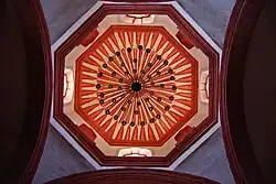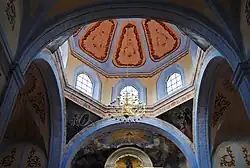 - Mision Santiago Apostol - the first church to be constructed in Jalpan was the mission established by Junipero Serra in 1751, with construction completed in 1758. Common among the Franciscan missions was the incorporation of indigenous icons and decorative styles, such as the double-headed eagle with a snake. The facade is very elaborate with symbols of the Franciscan order and an image of St. Francis of Assisi. The facade is built of stone and stucco. The interior of the cupola includes scenes of the Virgin of Guadalupe appearing to Juan Diego.