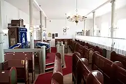 - 🌍 Adat Jeschurun. Orthodox synagogue. The interiors come from the Synagoge Bornstrasse in Hamburg, which survived the 1938 November pogroms (Kristallnacht) as it was in a tenement building. Due to the threat against the Jews, director Hans Lehmann, a German Jew residing in Stockholm, had the furnishing imported in March 1939. The pews, prayer books and the Torah Ark were labelled as "old furniture" to avoid suspicion from German authorities. The synagogue has been active in Stockholm since 1940.
