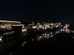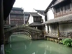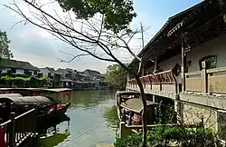 - 🌍 Yuehe Street (月河街, Moon River Street), Zhongji Road and surrounds. Another restored neighbourhood, this one on the north side of the old city, Yuehe Street or "Moon River Street" is named after a system of canals connected to the city moat, so-called because they are curved like the crescent moon. This used to be a centre of traditional commerce and light industry. As opposed to the elegant houses of prominent people featured on Meiwan Street, Yuehe Street features authentic shop and workshop buildings of a more "commoner" type, with numerous tea rooms, small restaurants, and sellers of Chinese cakes and baked goods. If your itinerary does not allow you to go on to Xitang or Wuzhen, Moon River Street is a good taste of what those canal towns are like. The Museum of Zongzi Culture is dedicated to the leaf-wrapped rice balls for which Jiaxing is famous. There are some large hotels in the same neighbourhood based in restored or newly built but traditional style houses.