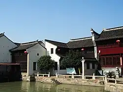 - 🌍 Meiwan Street (梅灣街, Plum Blossom Bay Street). A picturesque neighborhood in the southwest corner of the old city on the bank of the western South Lake, this area has been redeveloped, with several historic buildings restored and new buildings built in a sympathetic style. Apart from the traditional buildings - housing small museums, restaurants and bars - the area features winding brooks, willows and small lakeside parks. It is a favourite of local fishermen and also Korean tourists, who come here to see Kim Koo's Refuge, a house once used by important members of the Provisional Government of Korea during the Second World War, and where Korean revolutionary Kim Koo took refuge after his followers assassinated an important Japanese general in Shanghai (which is being renovated by the city government). Several other historic buildings are located here, including the former residence of Chu Fucheng, an early 20th-century Chinese politician who arranged Kim Koo's escape from Shanghai; Xu Yi Gu Hall, a former rice merchant; the architecturally noted former residence of Wang Huzhen (which is being renovated by the city government); and the former residence of Zhu Shenghao, poet and translator of Shakespeare into Chinese. Qingfen Hall, a family memorial hall belonging to the prominent Qian family of Jiaxing, is also here and is open to the public. Close to Meiwan Street is also the former residence of Shen Junru, prominent "third way" politician of the mid-20th century.