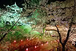 - Cherry-blossom viewing. In 1909, 2,200 cherry blossoms were planted by veterans. It was the first of Takada Park’s cherry blossom. Lots of lights (Bonnbori) lights up the turrets and cherry blossoms. And that view showed on a moat’s lake. It is very beautiful view. Sakura Road is also beautiful and fantastic. Many tourists come to see them in bloom, and it is now considered to be one of the nation's top cherry blossom viewing spots. The beginning of April to the middle of April is the best time to see. In that period, Hanami is held. In Hanami, you can enjoy not only seeing cherry blossoms but also eating Japanese foods like yakitori, yakisoba, takoyaki, because there are lots of street stalls. Now, this Hanami in Takada Park is called three big events of cherry-blossom viewing at evening in Japan.