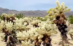 - 🌍 Cholla Cactus Garden (Jumping Cholla Patch), Pinto Basin Rd (15 miles / 24 km south of Twentynine Palms entrance; 20 miles / 32 km north of Cottonwood Visitor Center; 1.5 mile / 2.4 km west of Ocotillo Patch). A short walk leads through a thick stand of cholla cactus, noted for its especially prickly exterior. Near the transition between the Colorado and Mojave Deserts. Site includes a short 0.25 mi / 0.4 km loop trail through the patch.