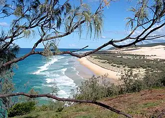 K'gari (pronounced "Gurri", formerly Fraser Island) is a large sand island 122 km (76 miles) long (the largest sand island in the world) situated off the southern coast of the Australian state of Queensland, some 300 km (200 miles) north of the state capital Brisbane. A popular destination for travellers, K'gari was inscribed as a World Heritage Site in 1992.