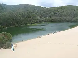 - Lake Wabby - a green colored barrage lake approximately 45 minutes walk from the beach, with a large sand blow that is slowly encroaching upon the lake. Freshwater turtles and catfish can sometimes be seen swimming in the lake. The path to the lake will split with only 100m difference between the two however the slightly longer way takes you over a sand dune. This split is well marked. If you take the one way into the lake over the sand dune you will be walking down the sand dune - much easier than up the sand dune. On the way out, walk along the lake with the lake on your right and you will see the second path at the edge of the lake taking you through the rainforest. Walking through the sand dune can get quite hot during the summer and it's a good idea to bring water along. Locals bring bodyboards to slide off the sand dune into the lake. Do not run into the lake off the sand and attempt to dive. Many people get seriously hurt and even paralyzed trying to do this every year. The only toilet facilities available are at the beginning of the walk in.
