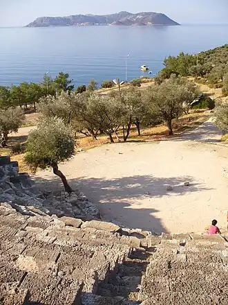 - 🌍 Antiphellos is the ruins of the port for the inland city of Phellos (below). It was populated from the 4th century BC and outgrew Phellos but declined after an earthquake and tsunami in 141/2 AD. The main features are the amphitheatre, and the "king's tomb" the best of many sarcophagi and rock tombs. The site is free to explore 24 hours.