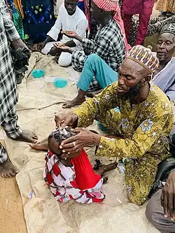 - Shaving and Barbing Day for Princes and Princesses initiates: On this day, the Ki Yenzide(Magajiya) cuts out little part of hair at the center of the head( here, the Princes and Princesses are given royalty names)at a cubicle-like building at the frontage of Emir's palace. From there, the princes and princesses moved to the next stage where group of shavers cut the hair completely, after cutting, they are taken to the Queen mother house where they will bath with water boiled with herbleaf called ewe okun. A new cloth is always worn after the bathing. After wearing the new cloth, the Princes and Princesses moves to the next stage which is drumming:drummer drums for the princes and princesses( there is this believe that if the Prince or princess being drummed for is not a real prince or princess, his or her body will get swollen). Each prince and princess brings 4 yards of cloth dropped in 2 buckets Infront of the drummer (this means 2 yards of cloth is dropped in each bucket).