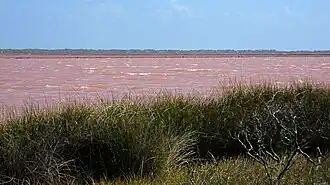- π Hutt Lagoon 55 km south of town is a lurid pink salt lake. The colour is from algae, which synthesise Ξ²-Carotene. You can admire it from the highway towards Northampton, or wind around the south tip to the lookout by Port Gregory on the coast. In summer much of it dries out into salt-pans. There are prawn farms in the lagoon, and no surprise their produce is pink. In 1943 a Japanese submarine bombarded Port Gregory, mistaking it for an ammo factory, but no-one noticed for a week until an intercepted radio report from the sub was decoded.
