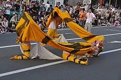 Kamaishi has a traditional dance called Toramae (虎舞), which translates to Tiger Dance. Each Tiger Dance group is composed of members of the same company or organization. During festival times, Tiger Dance teams can be seen throughout the day and night practicing and performing in the streets, accompanied by a taiko drummer, a handful of bamboo flute players, and a handful of singers with iron cymbals. Tiger Dance groups will travel along the main streets, entering businesses (and sometimes homes), and will perform a short dance to the people inside. This is viewed as a blessing and a favor and the dancers do not expect payment, although a glass of beer, sake, or tea would be readily accepted.