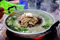 Another popular meal is Mu kratha (หมูกระทะ), offered at several open-air restaurants in town. Guests come in groups and take different ingredients (mostly pork) from a buffet to cook them on a small barbecue or in a hot pot at their tables (somewhat comparable to a raclette or fondue meal).
