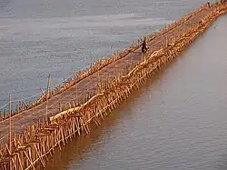 • The Bamboo Bridge and Koh Paen (a few blocks south of the bridge spanning the Mekong). A solid bamboo structure built on Koh Paen Island across the Mekong. On the other side are Cham and Khmer villages, entirely mounted on stilts. This is a great place to drive along if you want to check out the people. The bamboo bridge can even withstand trucks, so don't worry about whatever you're taking, just be careful not to fall into the river. The bridge is washed away as the river rises in the wet season, and access to the island is only possible by boat, but it is rebuilt again every dry season.Sometimes the locals might try to charge you a dollar for walking across, which is much more than the local toll.