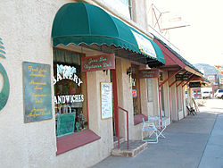 - π Bowman & Co. Building, 97 W. Center St./ HWY 89. One of the oldest standing buildings in town, was a Kanab's original mercantile. Built in 1892, by H.E.Bowman & Co., the building has housed a bank (the safe was installed in 1902), a Post Office, a general store (the upstairs was added in the 20s), an ice cream shop, an Italian restaurant and a pawn shop. Since April 2000, the building has been home to The Rocking V Cafe, an eclectic American bistro, serving lunch and dinner to locals and tourists from all over the world. The Rafters Gallery is upstairs displaying local art & the original rough sawn, full dimension lumber that makes up the support for the roof. Notice the safe at the back of main floor dining room and the walls of original adobe brick.