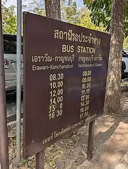 This bus is small and rudimentary and can get completely full and this can be an uncomfortable experience if you don't get a seat (if you're tall you may not be able to fully stand). For the ride back to Kanchanaburi the schedule is: 08:30, 10:00, noon, 14:00, 15:00, 16:30 (as read from sign at stop, edited 1/2025).