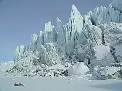 - 🌍 Greenland Ice Sheet. It begins at the upper end of the valley to the east of town and is a spectacular sight to behold. The ice sheet can be reached at the end of the gravel road which leads out of town from near the east end of the runway. The nearest point of ice is Russel's Glacier, about 20 km (14 mi) from town, but the road is fairly flat so that the entire hike can be completed in a good Kangerlussuaq summer day, though it is generally more fun to take 2-3 days and spend some time near the ice, and perhaps continue further up the road to some of the lakes edging the ice, with small icebergs floating in them. Be prepared for colder temperatures near the ice, as it can significantly decrease the temperature of the surrounding air, and set up a constant daytime "ice breeze" of cold air blowing from the glacier. The image at the top of the article shows that glacier.