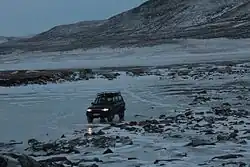 A few other dangers are presented by the geography. The river coming from the ice cap, which passes by town and empties into the head of the fjord, has deposited huge silt flats which can be very unstable and present large areas of quicksand indistinguishable from harder sand. For this reason, do not venture out into the river bed, and do not drink the silty water coming from the glacier as the extremely fine silt can wreak havoc on your intestines, and clogs even the best of filters (water in ponds and streams elsewhere is perfectly safe). Finally, if you go to the edge of the inland ice in summer, beware that it is an active glacier and huge calving events can happen at any time, dropping tons of ice accompanied by bursts of pent-up, near-freezing melt water. Keep a safe distance from the edge.