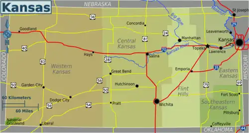 | Central Kansas A mixture of farmland, rolling hills, and man-made lakes, it is a transition zone between the hilly east and the arid west. Home to Wichita, the largest city in the state. |