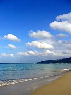 Few, if any, hotels have direct beach frontage. Most are across the road (which usually is not a busy one). The entire beach is public (as are all beaches in Thailand). Large resort complexes line the opposite side of the road from the shoreline, but the long, broad beach itself has no development. The sand is very white, and squeaks audibly when walked upon. The southern point has a fine coral reef stretching toward Kata and Bu Island. Also, there is a wide pedestrian / bicycle path on the beach side of the road running the length of the beach.