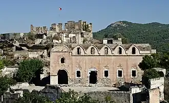 - 🌍 Afkule is a Greek Orthodox monastery clinging dramatically to the sea cliffs, abandoned after 1923. From the west end of the village, turn off Gemiler Cd. onto a dirt track. This is suitable for 2WD and goes west through the pine forest for 1 km to end at a car park. Take the obvious trail northwest for 1 km, way-marked in yellow and red, to the cliff above the site. Take great care on the descent into the monastery, and the lowest sections to the church and monks' residences are precipitous.