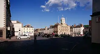 Kelso is a small market town in the Borders region of southern Scotland, with a population of 6900 in 2020. Its name probably derives from Calk Heugh - the "chalk outcrop" which its two rivers cut through. These are the Teviot and Tweed, joining here, both famed for salmon fishing. The town grew up around its Abbey, whose monks farmed the fertile valleys. Its town centre is of a style common in northern France and the Low Countries but rare in Scotland, with a large market square, and Flemish-style buildings. The main reasons to visit are the Abbey and Floors Castle.