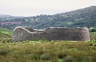 - π Staigue Stone Fort is an Iron Age ringfort of circa 300-400 AD. It has sturdy drystone walls and an encircling ditch. It's at the head of a valley and commands great views yet can't be seen from below, no accident surely. Drive up the 4 km access lane from Castlecove, which is narrow but in good repair, to the car park. The site is free to access 24 hours.