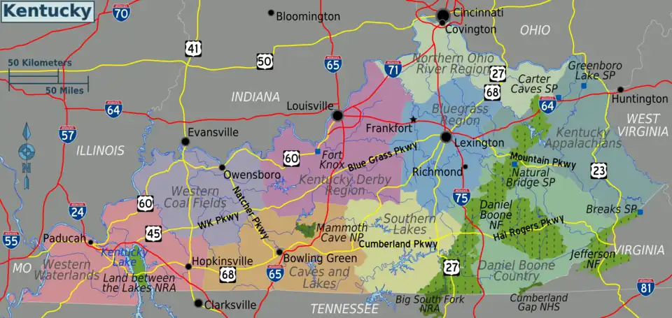 Kentucky's major urban areas are the Louisville Metro, the Northern Kentucky suburbs of Cincinnati, and the Lexington-Frankfort-Richmond area. The majority of the state is fairly rural, though. Visitors from more urbanized areas sometimes find it striking how quickly you're "out in the country" when driving outside of a major city. Eastern Kentucky is part of the Appalachians, mostly containing part of the rugged Appalachian Plateau including the beautiful and very sparsely populated Daniel Boone National Forest, within which is the famous Red River Gorge with its natural arches.