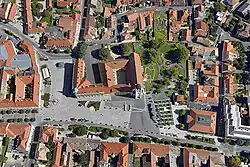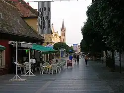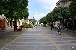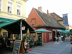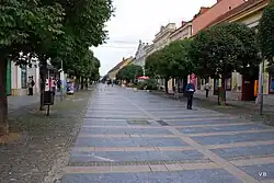 The center of Keszthely is a large square alongside the Lajos Kossuth street. The section of Lajos Kossuth street leading from the square to the Festetics Palace is now a pedestrian mall, were one can find a number of fine restaurants, which – in season – serve large numbers of alfresco diners.