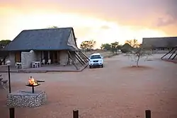 - !Xaus Lodge, ☏ +27 21 701 7860, info@tfpd.co.za. !Xaus Lodge is a 24-bed thatched luxury lodge, owned by the ‡Khomani San and Mier communities, that overlooks a large salt pan. The viewing deck offers the chance to observe the animals at the waterhole below. Other amenities include a plunge pool and curio shop.