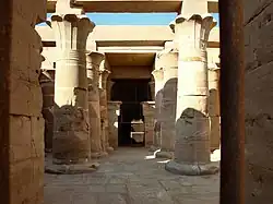 - 🌍 Temple of Hibis. 2 km north of Kharga town, is a large well-preserved temple from the Saite-Persian period of 664-404 BCE. It originally stood on a lake island in the town of Hibis, but lake and ancient town are now farmland, and Hibis means "plough". The temple is dedicated to two versions of the god Amun. You enter down a long hallway lined with sphinxes, through several pylons into the main temple. The hypostyle hall has walls shaped like huge papyrus rolls, richly decorated. One of these, showing Seth defeating Apep, is a foretaste of Saint George and the Dragon. The naos or inner shrine has a pantheon of Egyptian deity and royal figures, with almost 700 figures. Adult admission LE80, combi-ticket with El Bagawat LE120, as of Nov 2019.