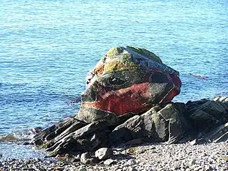 - Painted rocks: there's a tradition of painting the large glacial boulders along the beach, one example being "Tut-Tut" as it spoofed a pharaoh's head. This tradition is over a century old, as "Para Handy" in Neil Munro's tales of the Clyde Puffers once claimed to have painted several. These artworks come and go as wind and waves scour away the paint and other artists see opportunities. So just look out for examples.