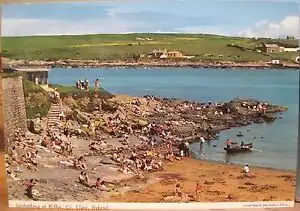 Kilkee (Cill Chaoi, "Church of Chaoineadh Ita β lamentation for Ita") is a small town in County Clare in the west of Ireland. It was the seaside resort of Limerick in Victorian times, when wealthy merchants families retired here for the summer season, and built the many substantial summer houses that are now small hotels and guesthouses. Kilkee had a population of 1200 in 2022.
