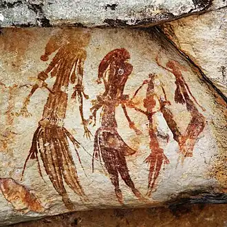 - Aboriginal rock art: the indigenous people fashioned art in many mediums (fabrics, wood, jewellery, sculpture) and continue to do so, but rock art is the oldest work and the most likely to stay at its original site. Some has been moved to museums, some stolen or defaced, so the in-situ examples are in remote spots guarded by their traditional custodians. Best known are those on the Mitchell Plateau, with the Gwion Gwion or Bradshaw Figures and the Wandjina Figures. That area is reached by a 300 km track branching off Gibb River Road towards Kalumburu. Ancient art may have been retouched or reworked in later times, as skilfully and respectfully as the Europeans repair their churches.
