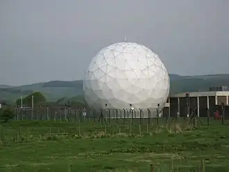 - π The golf ball west of town is the radar dome of a former Ministry of Defence (MOD) communications base, containing a large dish antenna. Balado Bridge was an RAF airfield 1942-57 then from 1985 to 2006 was a Satcom II Satellite Ground Listening Station. From 1997 to 2014 the nearby fields hosted βT in the Parkβ music festival, which then moved to Strathallan Castle then folded. The airfieldβs hard standing nowadays supports a fine array of chicken sheds. The MOD sold the site in 2007; in the years since it's been back on the market with an asking price of Β£1 million. The main blockhouse is claimed to be proof against chemical and nuclear attack and chickens. No public access to the site but you see enough from the road.